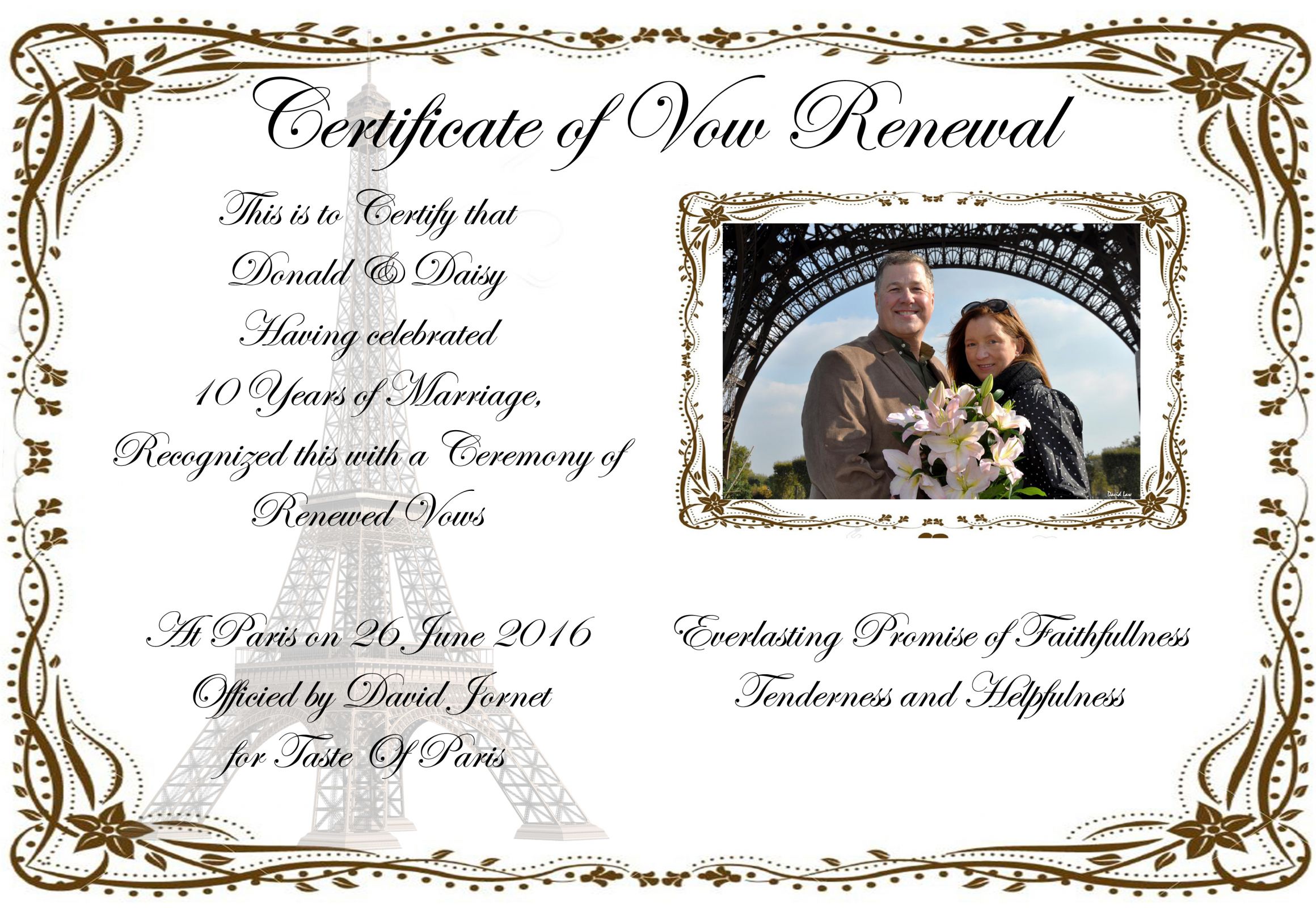 We had a wonderful. moving experience with Renew Your Wedding Vows in Paris with photos to memorialize it. We met our photographer Anne at the carousel by the Eiffel approximately one hour before our ceremony. This allowed us to take photos in and around Palais de Chailloit so that we could have terrific images of us with the Eiffel Tower behind us. Anne provided very good recommendations for where and how we should pose and she was very open to our suggestions as well. At the end of the photo shoot, we met our celebrant at the garden inside Pailas de Chaillot for a lovely, touching wedding vow renewal ceremony Anne captured photos of it all. It was a thoroughly lovely, touching and enjoyable experience. Highly recommended!